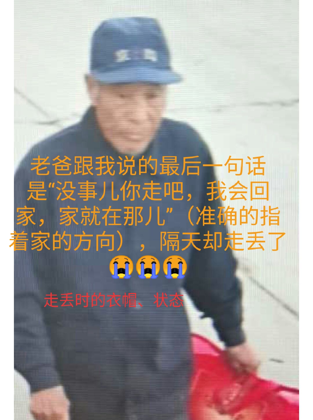 正文 失踪人员:李会田 访客 V游客 /2020-07-11/5.92 K阅读/0评论 0711 姓名: 李会田 性别: 男性 生日: 1942/12/09 籍贯: 河北省秦皇岛市卢龙县 失踪时间: 2020/04/29 失踪地点: 河北省秦皇岛市卢龙县卢龙镇胡家仙河村 失踪时身高: 165厘米左右 在线联系: 微信号:shandong-1218 详情 紧急寻找老父亲:李会田,男,79岁,秦皇岛市卢龙县卢龙镇胡家仙河村人。个不太高165厘米左右,体型偏瘦。走时头戴蓝色鸭舌帽(帽子前脸有“京局”两字),身穿蓝色工装上衣(见照片)、藏蓝色运动裤,脚穿黑色系带鞋。(这么长时间了,老人状态应该比较狼狈了。)老人于2020年4月29日凌晨三点从家里走出去,至今未归(天黑迷失方向)。老人因小脑萎缩,记忆丧失,可能不记得自己姓名住址,不爱与人交流,走前有垃圾箱捡垃圾习惯。有看到他的好心人请把他留住并联系我们(拍照),电话:15133599268,13643354888,家人不胜感激,必有重谢 寻人启事资料、照片等均由用户提供,如侵犯任何第三人肖像权、隐私权或其他合法权益,请联系本站删除!